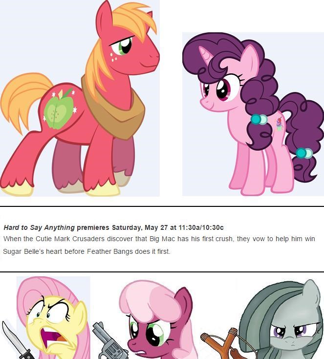 When the CMCs figure out that Big Mac has his first crush they vow to help him win Sugar Belles heart against the competition of Feather Bangs. 37893474 shitty home videos of brony hangouts ongoing plot this board was actually interesting i 37893179.